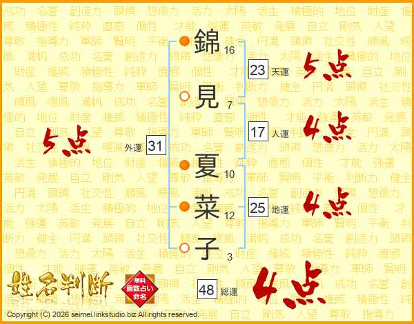 錦見夏菜子さんの外運は31画の5点!