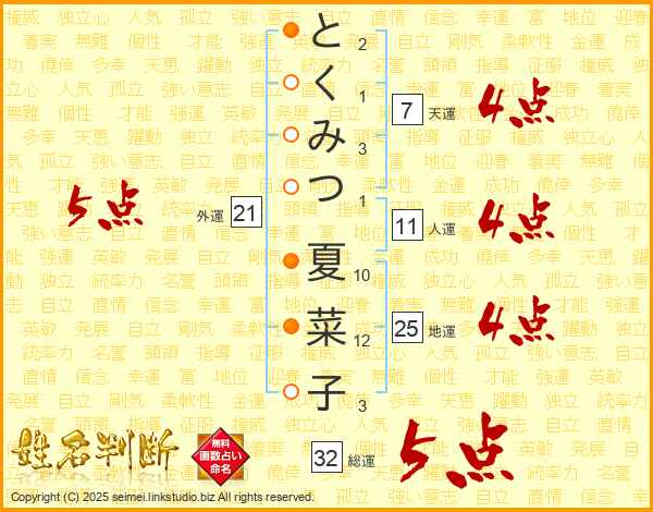 と(2画)く(1画)み(3画)つ(1画) 夏(10画)菜(12画)子(3画)