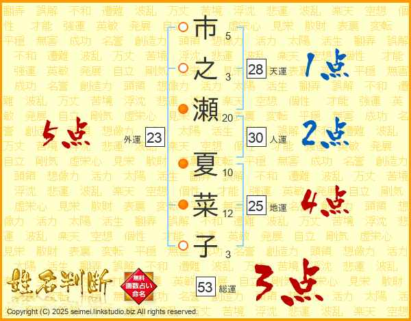 市(5画)之(3画)瀬(20画) 夏(10画)菜(12画)子(3画)