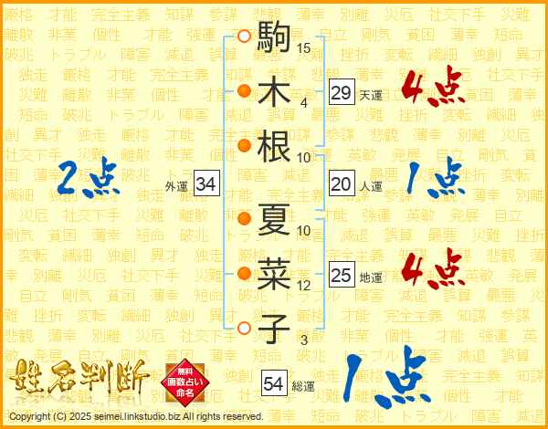 駒(15画)木(4画)根(10画)  夏(10画)菜(12画)子(3画)