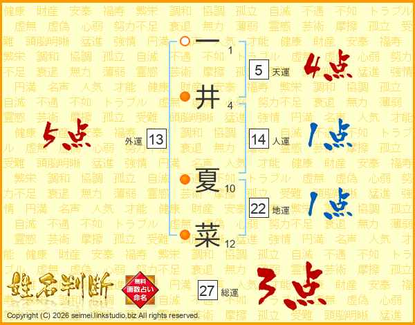 生活面を象徴する運勢です。外部から受ける影響力を表し、結婚運、家庭運や職場、環境への順応性を表します。総運から人運を引いた画数。姓や名が1文字の場合を除く。