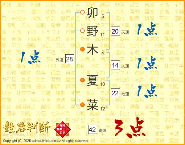 卯(5画)野(11画)木(4画) 夏(10画)菜(12画)
