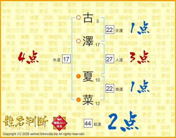 古(5画)澤(17画) 夏(10画)菜(12画)