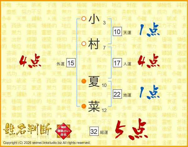 小村夏菜さんの総運は32画の5点!