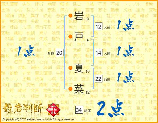 岩(8画)戸(4画) 夏(10画)菜(12画)