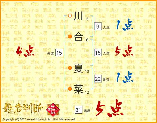 生活面を象徴する運勢です。外部から受ける影響力を表し、結婚運、家庭運や職場、環境への順応性を表します。総運から人運を引いた画数。姓や名が1文字の場合を除く。