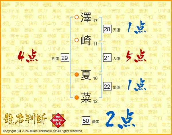 澤(17画)崎(11画) 夏(10画)菜(12画)