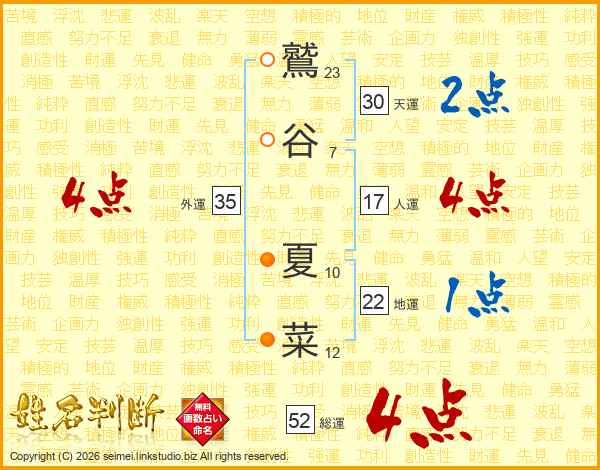 鷲(23画)谷(7画) 夏(10画)菜(12画)