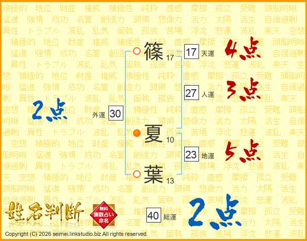 生活面を象徴する運勢です。外部から受ける影響力を表し、結婚運、家庭運や職場、環境への順応性を表します。総運から人運を引いた画数。姓や名が1文字の場合を除く。