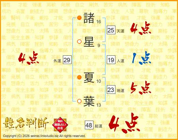 諸(16画)星(9画) 夏(10画)葉(13画)