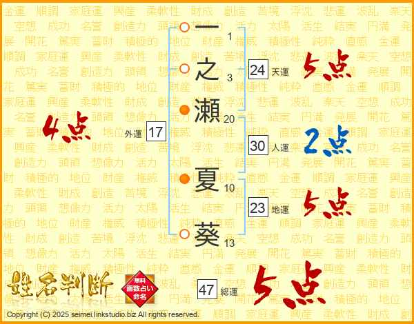 一之瀬夏葵さんの総運は47画の5点!