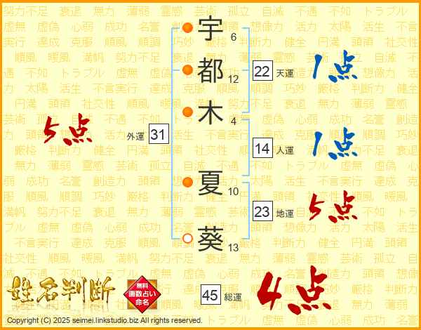宇(6画)都(12画)木(4画) 夏(10画)葵(13画)
