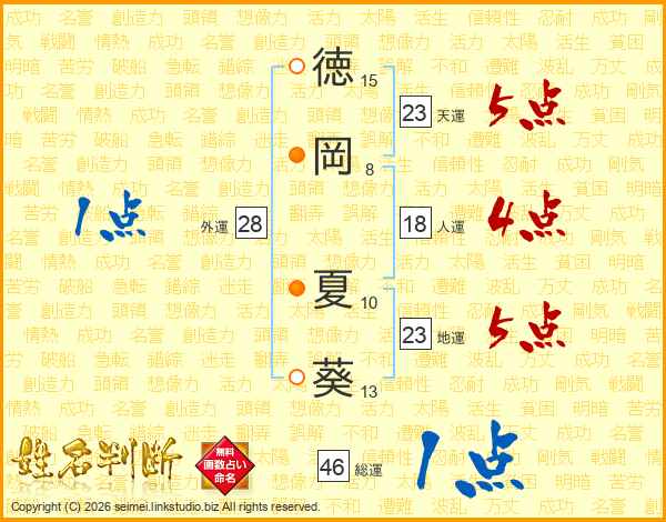 徳(15画)岡(8画) 夏(10画)葵(13画)
