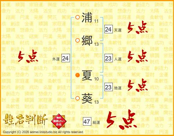 浦(11画)郷(13画) 夏(10画)葵(13画)