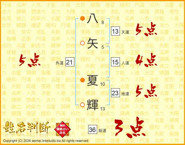八矢夏輝さんの天運は13画の5点!