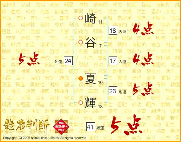 崎(11画)谷(7画) 夏(10画)輝(13画)