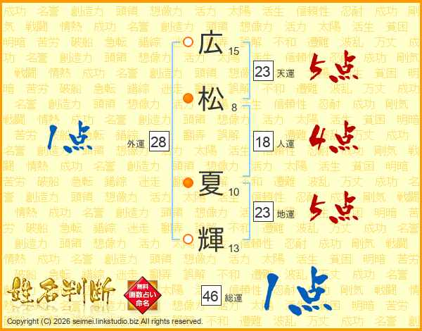 生活面を象徴する運勢です。外部から受ける影響力を表し、結婚運、家庭運や職場、環境への順応性を表します。総運から人運を引いた画数。姓や名が1文字の場合を除く。