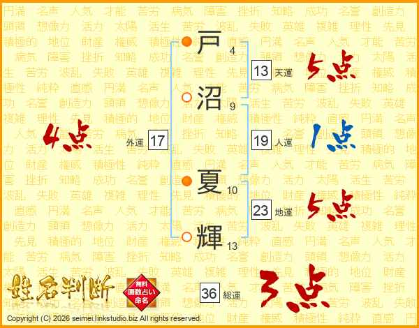 戸沼夏輝さんの天運は13画の5点!