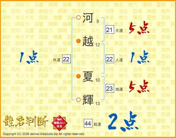 あなたの人生を表す1番重要な運勢です。生涯を通じて影響する総合運となり、主に50歳以降の晩年期に影響を及ぼします。苗字と名前の合計画数。