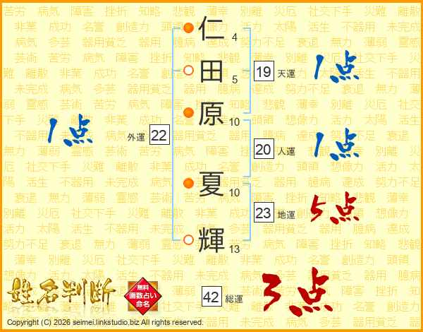 仁(4画)田(5画)原(10画) 夏(10画)輝(13画)