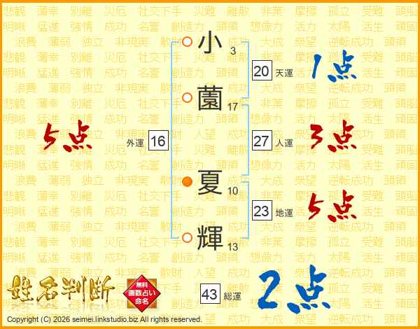 小(3画)薗(17画)  夏(10画)輝(13画)