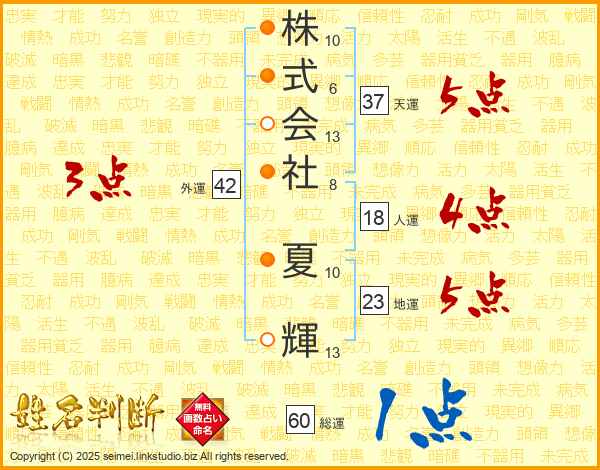 株式会社夏輝さんの総運は60画の1点!