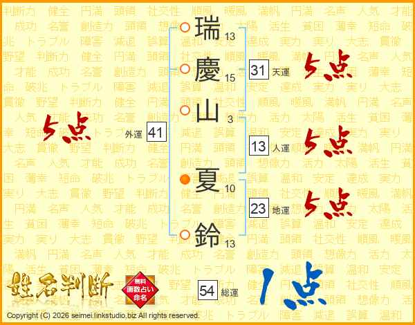 瑞(13画)慶(15画)山(3画) 夏(10画)鈴(13画)