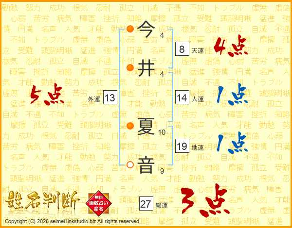 今(4画)井(4画) 夏(10画)音(9画)