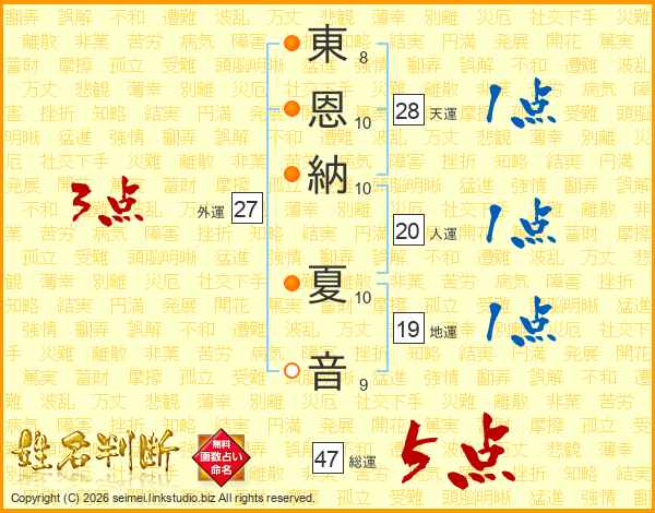 東(8画)恩(10画)納(10画) 夏(10画)音(9画)