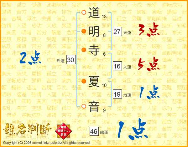 道(13画)明(8画)寺(6画) 夏(10画)音(9画)
