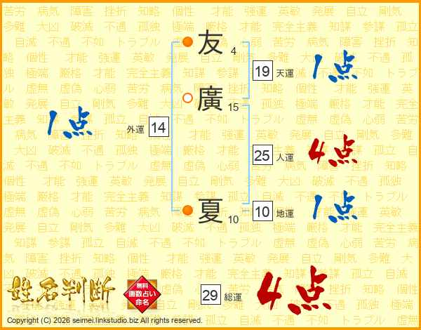 友廣夏さんの総運は29画の4点!
