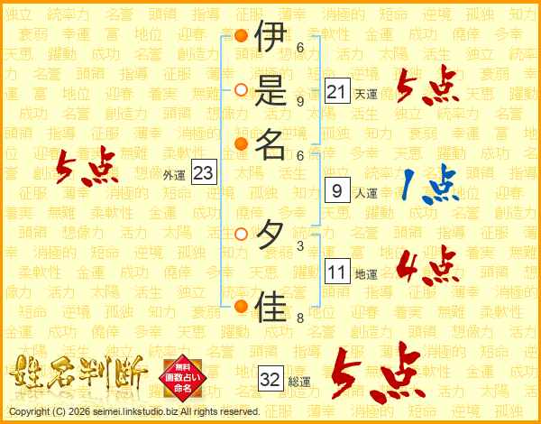 伊是名夕佳さんの総運は32画の5点!