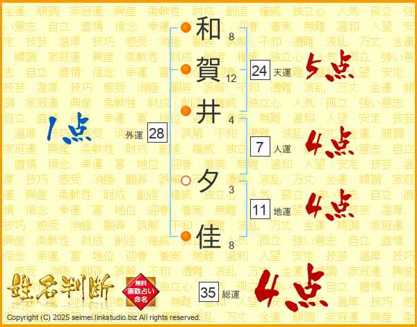 和(8画)賀(12画)井(4画) 夕(3画)佳(8画)