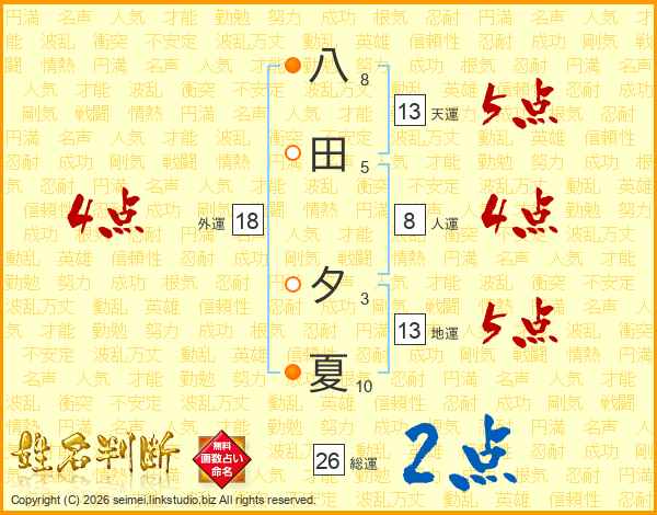 生活面を象徴する運勢です。外部から受ける影響力を表し、結婚運、家庭運や職場、環境への順応性を表します。総運から人運を引いた画数。姓や名が1文字の場合を除く。
