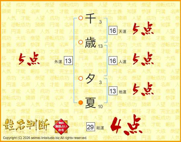 千(3画)歳(13画) 夕(3画)夏(10画)