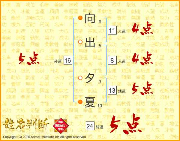 生活面を象徴する運勢です。外部から受ける影響力を表し、結婚運、家庭運や職場、環境への順応性を表します。総運から人運を引いた画数。姓や名が1文字の場合を除く。