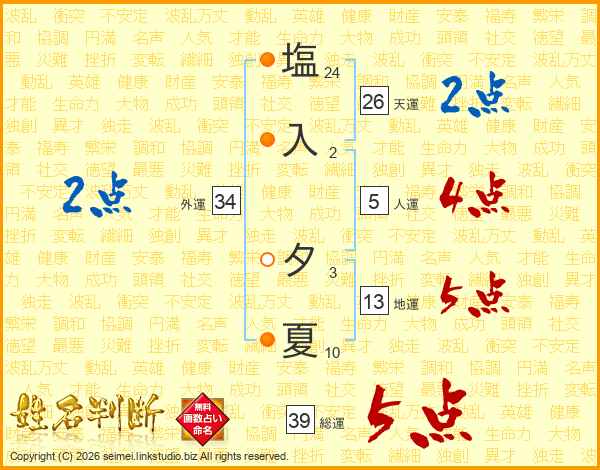 塩入夕夏さんの総運は39画の5点!