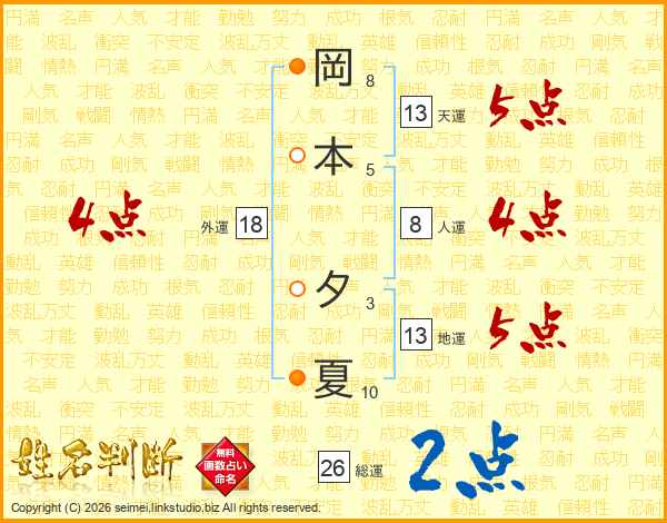 岡(8画)本(5画) 夕(3画)夏(10画)