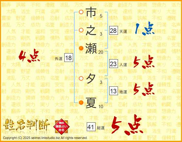 市(5画)之(3画)瀬(20画) 夕(3画)夏(10画)