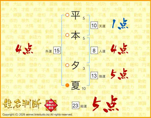 あなたの人生を表す1番重要な運勢です。生涯を通じて影響する総合運となり、主に50歳以降の晩年期に影響を及ぼします。苗字と名前の合計画数。