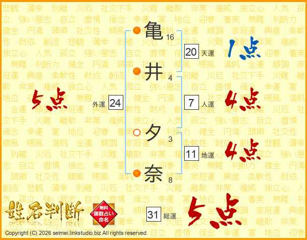 亀(16画)井(4画) 夕(3画)奈(8画)