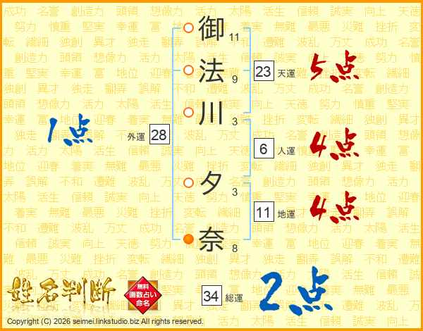 御(11画)法(9画)川(3画) 夕(3画)奈(8画)
