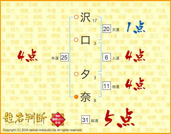 沢(17画)口(3画) 夕(3画)奈(8画)