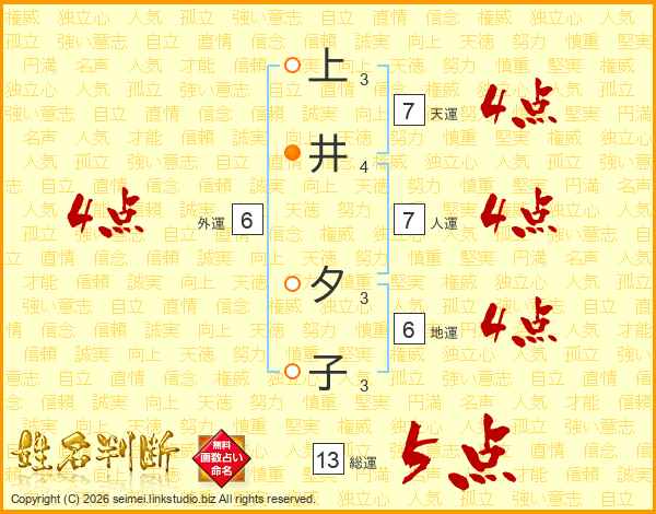 生活面を象徴する運勢です。外部から受ける影響力を表し、結婚運、家庭運や職場、環境への順応性を表します。総運から人運を引いた画数。姓や名が1文字の場合を除く。
