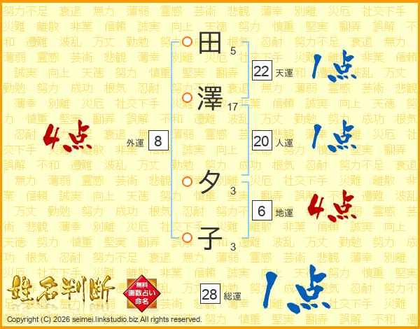 生活面を象徴する運勢です。外部から受ける影響力を表し、結婚運、家庭運や職場、環境への順応性を表します。総運から人運を引いた画数。姓や名が1文字の場合を除く。