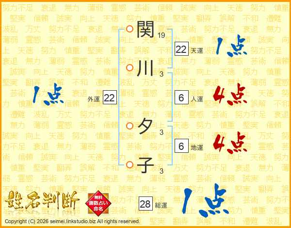 関川夕子さんの総運は28画の1点!