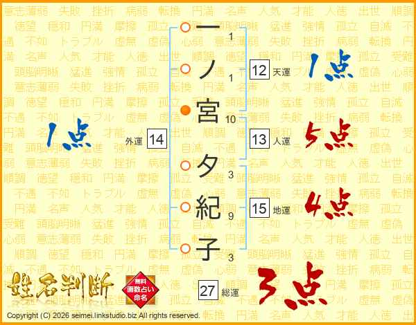 一ノ宮夕紀子さんの総運は27画の3点!