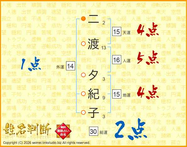 二(2画)渡(13画) 夕(3画)紀(9画)子(3画)