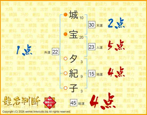 城(10画)宝(20画) 夕(3画)紀(9画)子(3画)