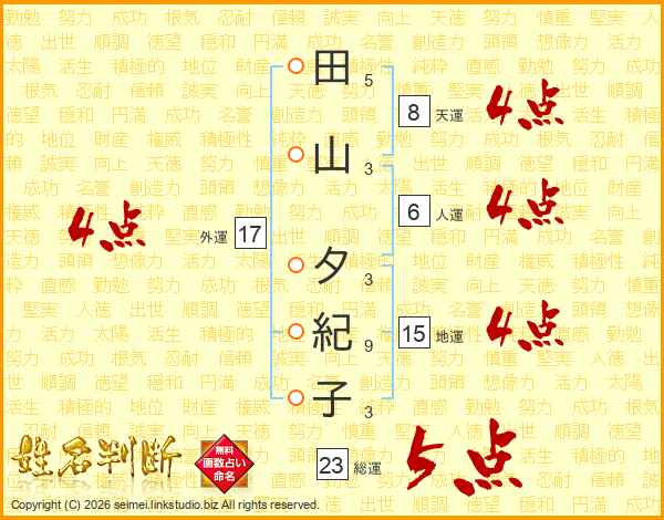 田(5画)山(3画) 夕(3画)紀(9画)子(3画)